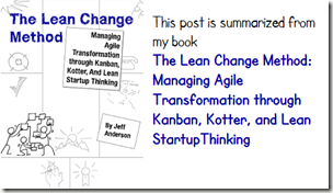 For more check out the Lean Change Method: Managing Agile Transformation with Kanban, Kotter, and Lean Startup Thinking